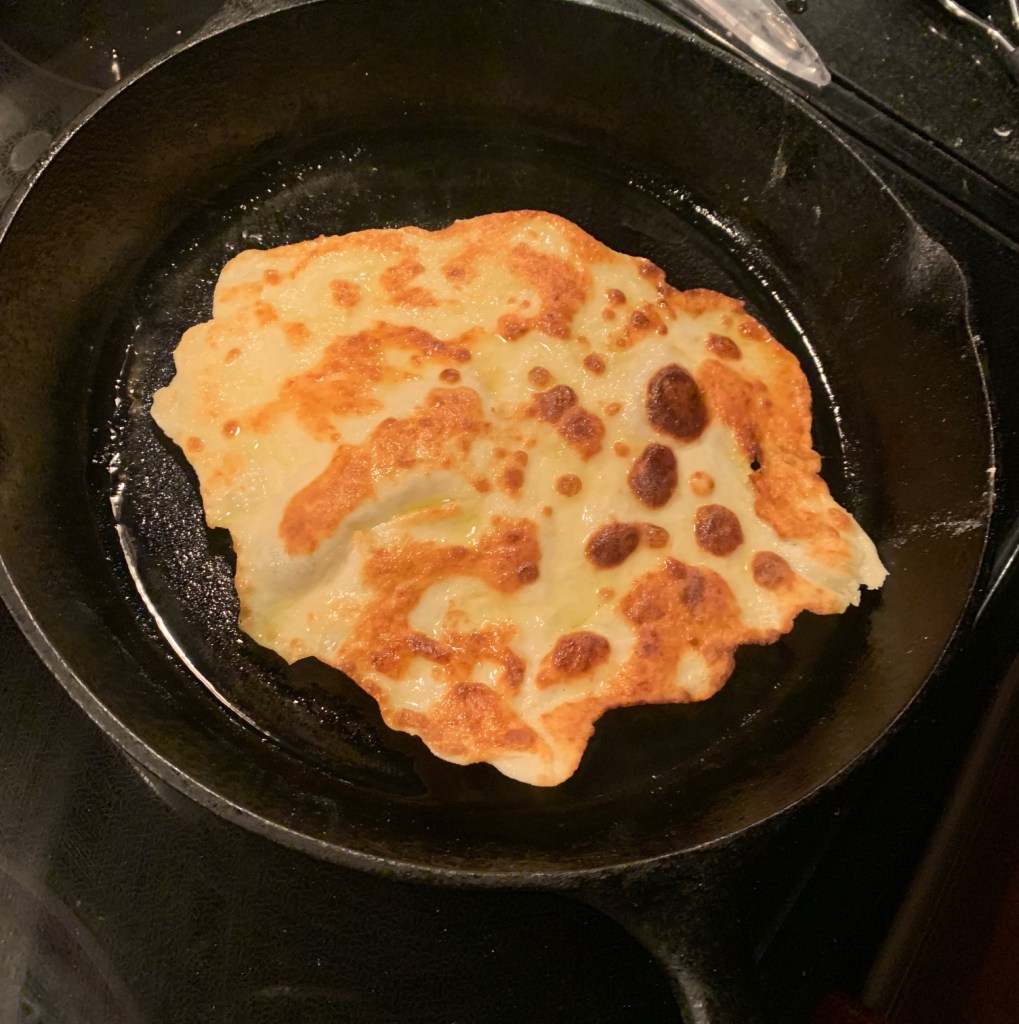 Cast iron pan goes onto the stovetop, filled with olive oil base upon which to fry the flatbread.