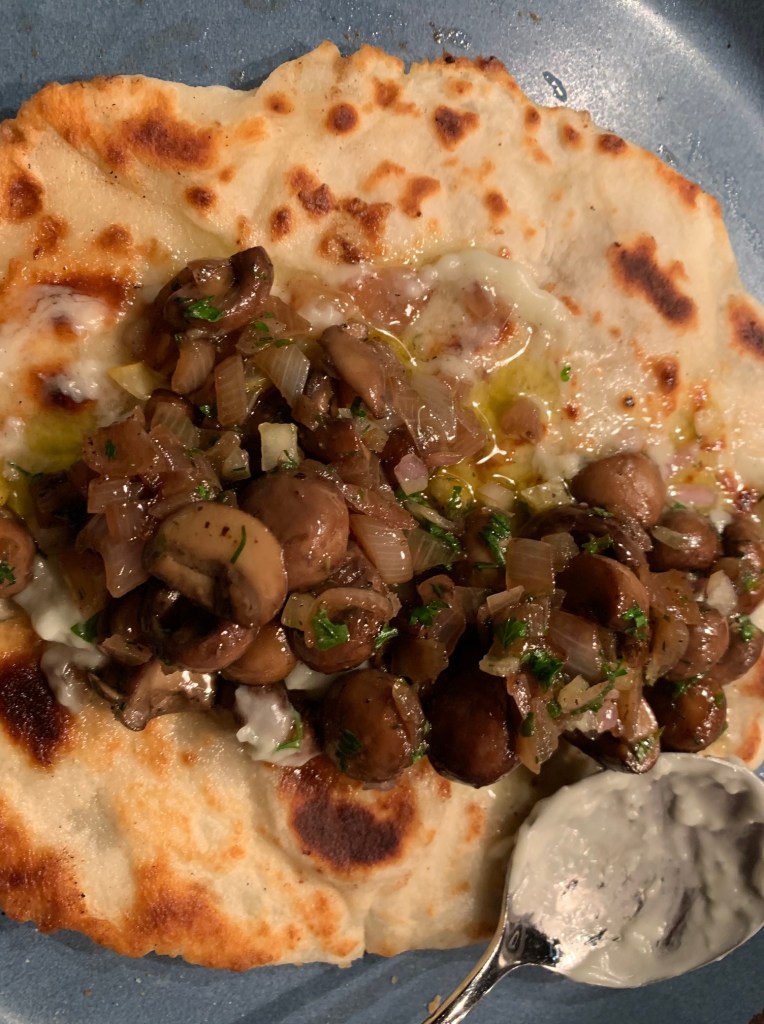 One small critique: it was a bit drippy. I like a messy sandwich but if you don’t, I recommend scooping the mushrooms with a slotted spoon to reduce the amount of juices in the flatbread.