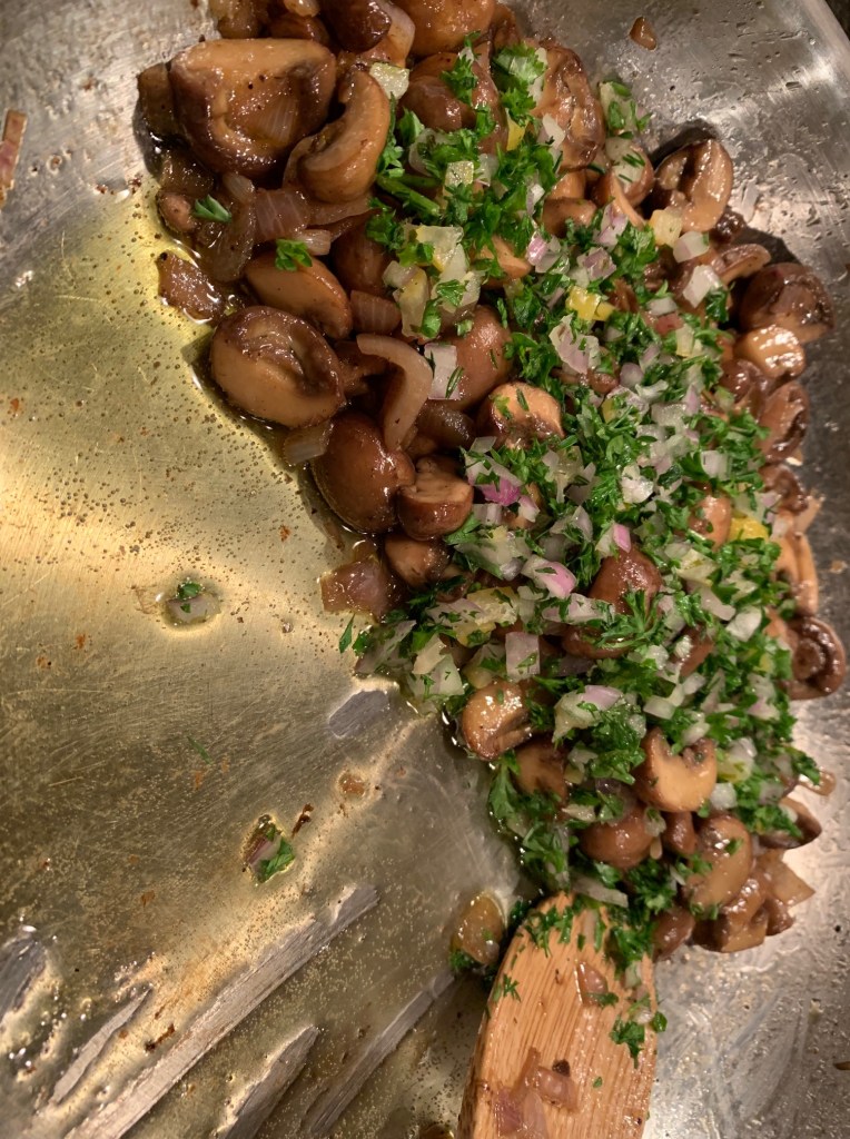 For brightness I add an herb salad of: 1 tbsp fresh tarragon, 2 tbsp fresh dill, 3 tbsp fresh chopped parley, 1 tbsp minced preserved lemon peel, juice of one lemon. Toss that into the mushroom mixture.