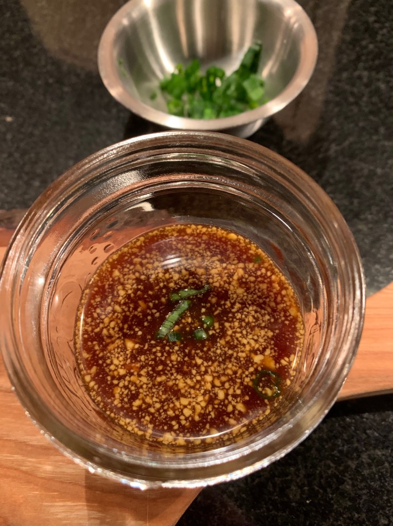 When this sandwich is ready (it doesn’t take long on the stovetop) I want to serve it with a side dip, so I make one out of the juice of one meyer lemon, 1/3 cup tamari, and a half teaspoon of wasabi paste for a heat kick; green onion for garnish.