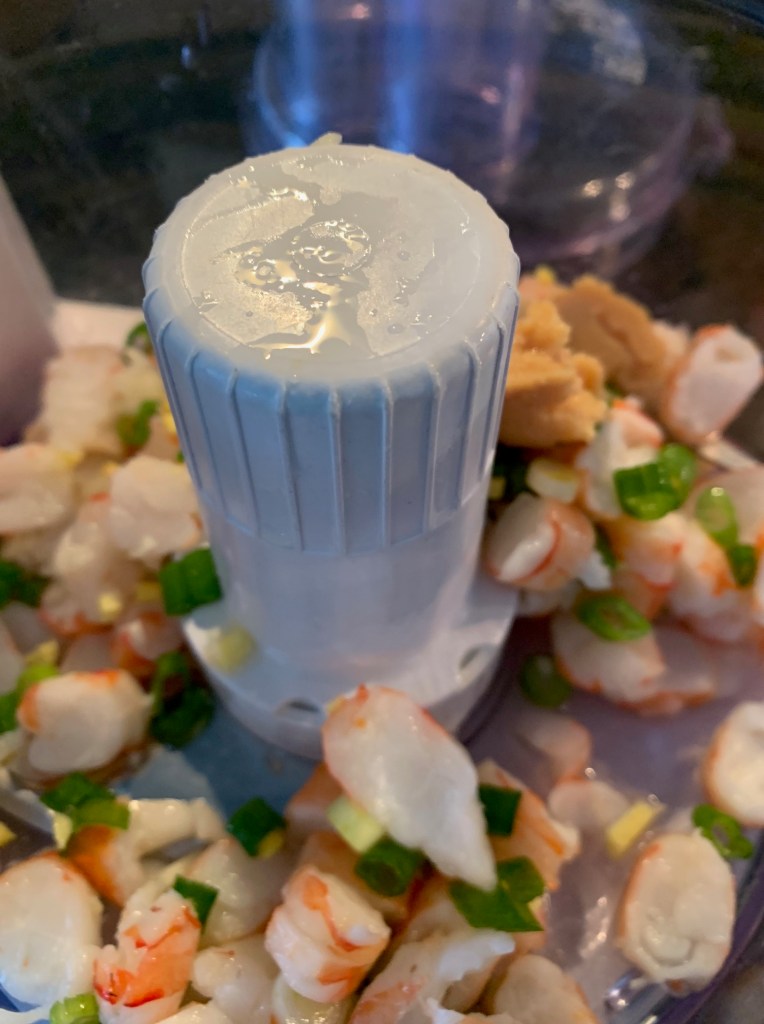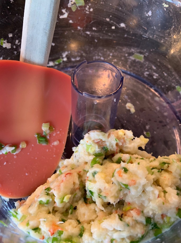 I coarsely chop a dozen cooked shrimp which will become the star of this show, and add that, along with my flavour base, into the food processor. Don’t forget to squeeze the juice of one lime into that.
