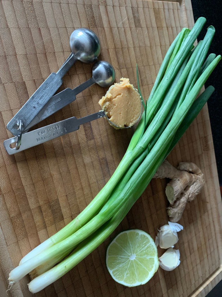 I start with my flavour base: a tablespoon of white miso, a teaspoon of minced ginger, a minced clove of garlic, a teaspoon of minced green onion for the flavour base and another teaspoon set aside for the garnish. Fresh lime for brightness.
