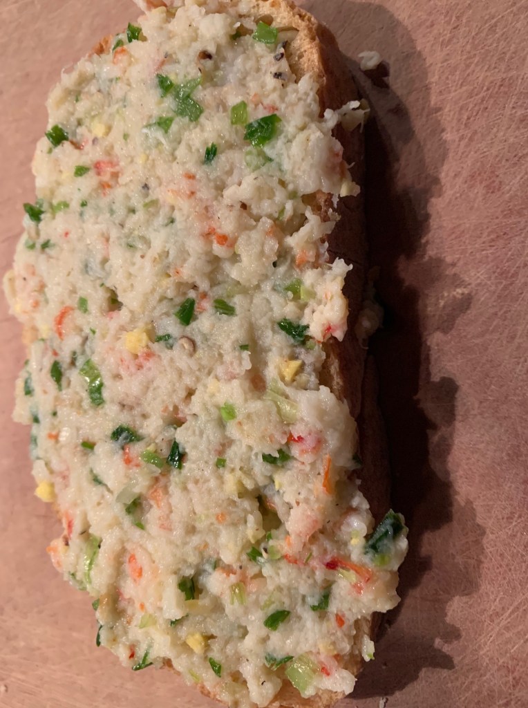 I’m looking at this paste and decide it needs a binder, so I add a healthy tablespoon of mayo, then spread that paste onto a slice of crusty bread (Italian, sourdough all good).