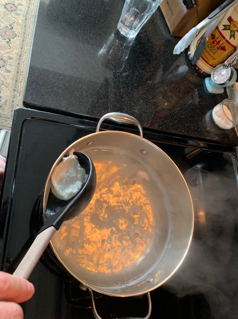Once the eggs are in, stop stirring and wait. I want a soft yolk, so after bathing in the water for two minutes, eggs come out—gently, one at a time, with a large spoon; tilt that spoon to get rid of excess water.