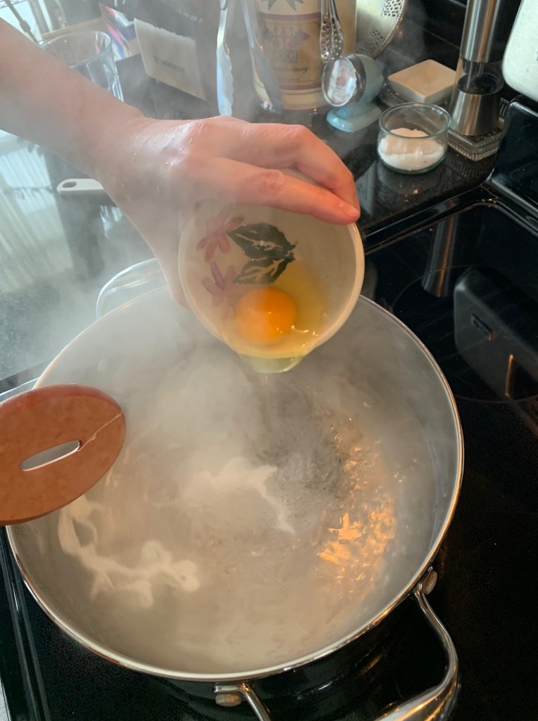 First things first: you need your mise en place before you really get rolling because all the action happens quickly. Fill a large pot with water up to the halfway mark and add a couple of glugs of plain vinegar. You can get that water simmering while you prepare everything else.