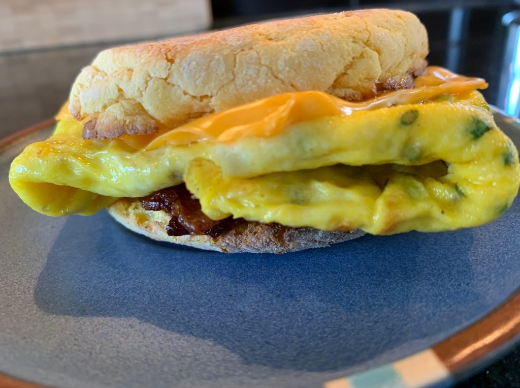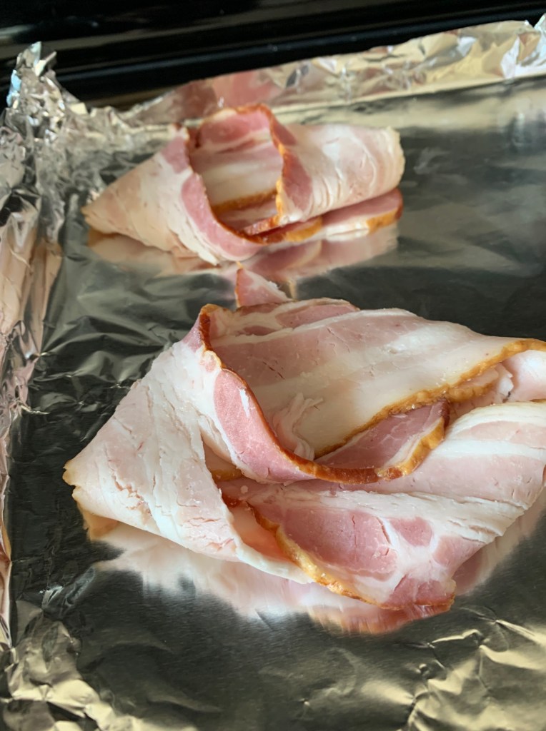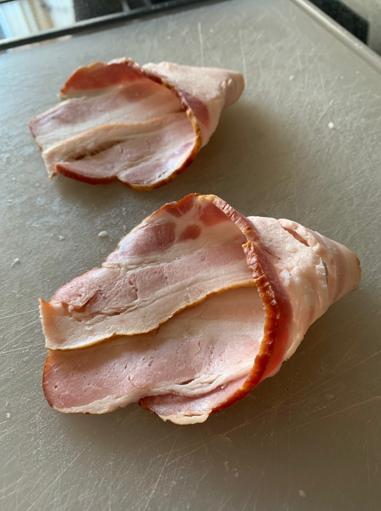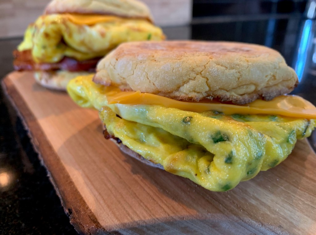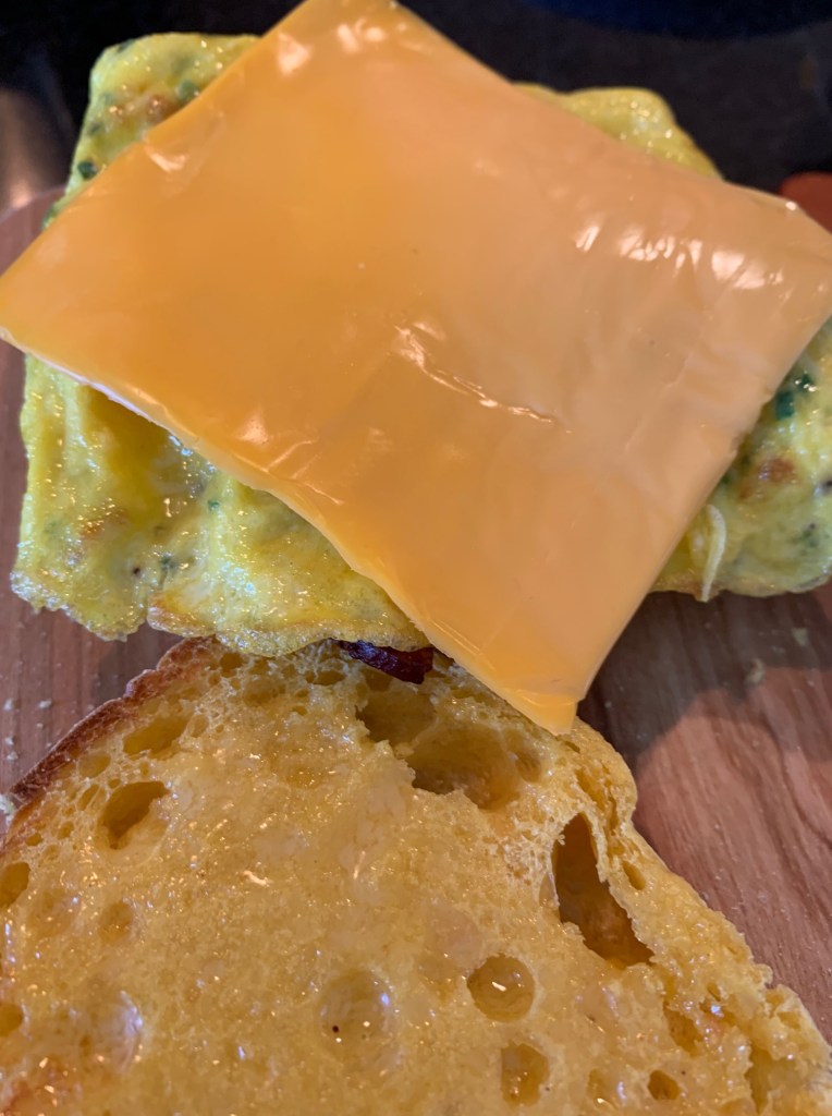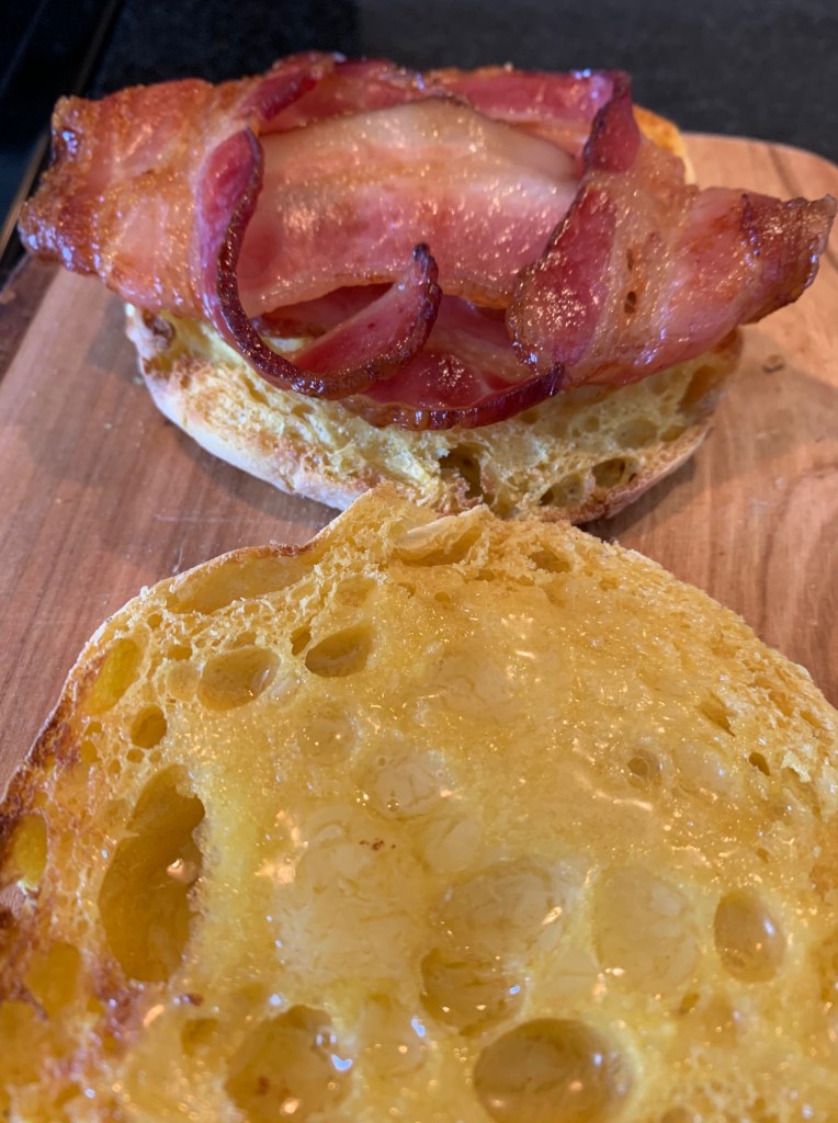 Toast and butter the english muffins. It’s sandwich building time! Bacon goes down on the button english muffin.