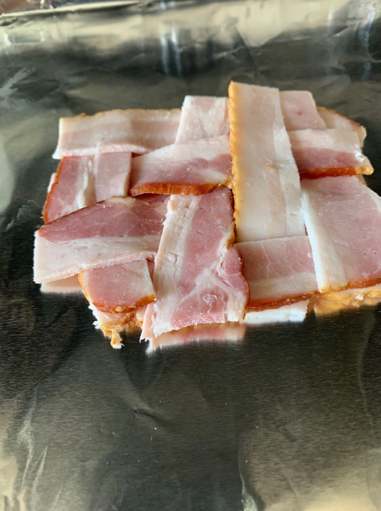 See how he just weaves the bacon into a lattice square? That goes down on a pan lined with tin foil. Now for the nests. Step one, fold two slices of bacon into this shape.
