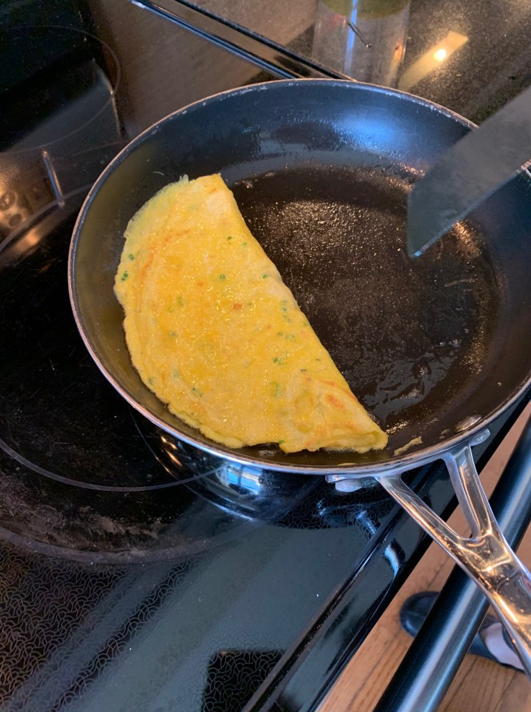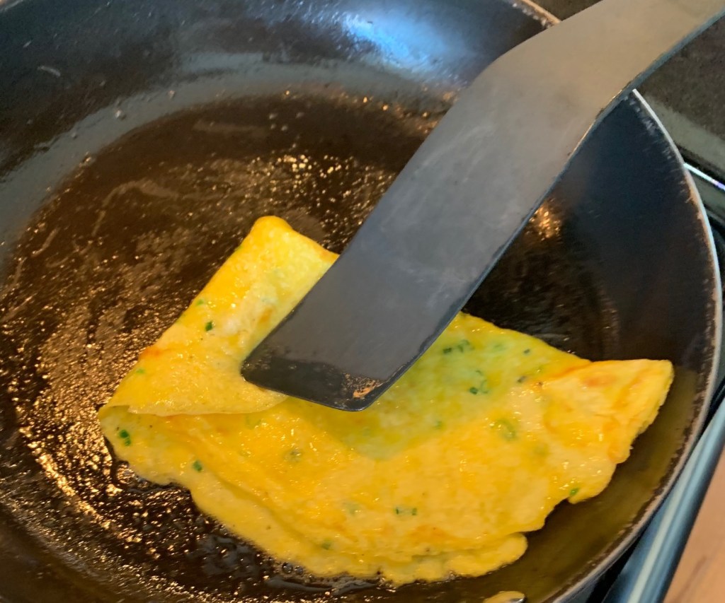 Craig tells me to swirl those eggs around, gently shaking the pan so that the egg is evenly spread throughout the pan. Let the bottom crisp up then fold that omelette in half with your spatula.
