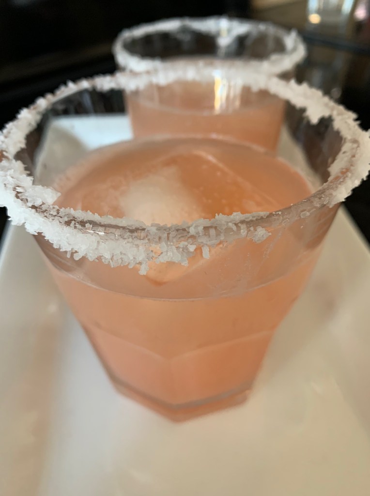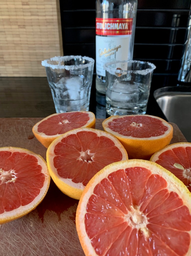 I juice six grapefruits (strained), salt rim two cocktail glasses, throw in a large square of ice, and add 1 ounce of vodka. Top that up with fresh grapefruit juice. Delicious.