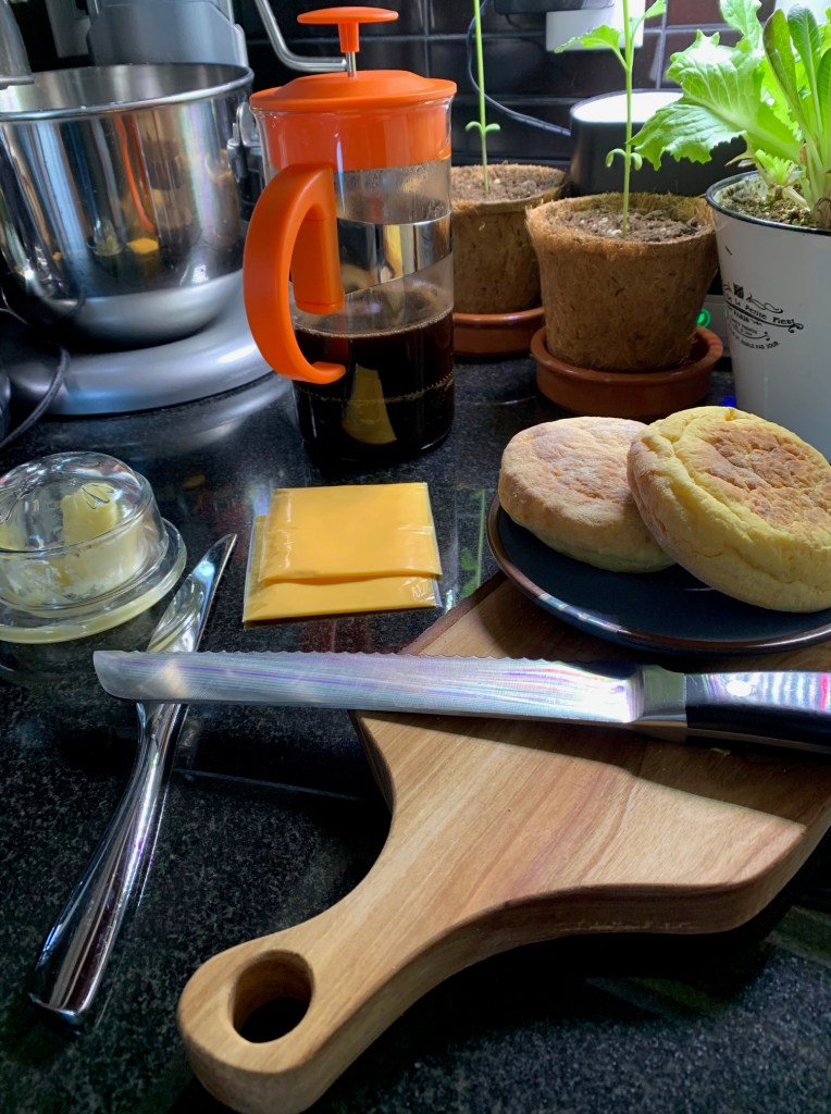 Now to get down to business. I’ve got my english muffins, cheese slices, and butter waiting for action. You want to get that ready ahead of time so you can quickly plate everything at the end.