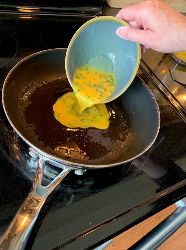 The bacon tray goes into a 350 F for about 20 minutes. Meanwhile, let’s get started on the omelette. Craig usually makes the omelettes at our place, so he teaches me how to do it. Four eggs go into a bowl, along with 2 tbsp milk, a crack of black pepper, and two tsp of finely minced fresh chives (use whatever herb you have on hand). Gently whisk until the ingredients are incorporated.