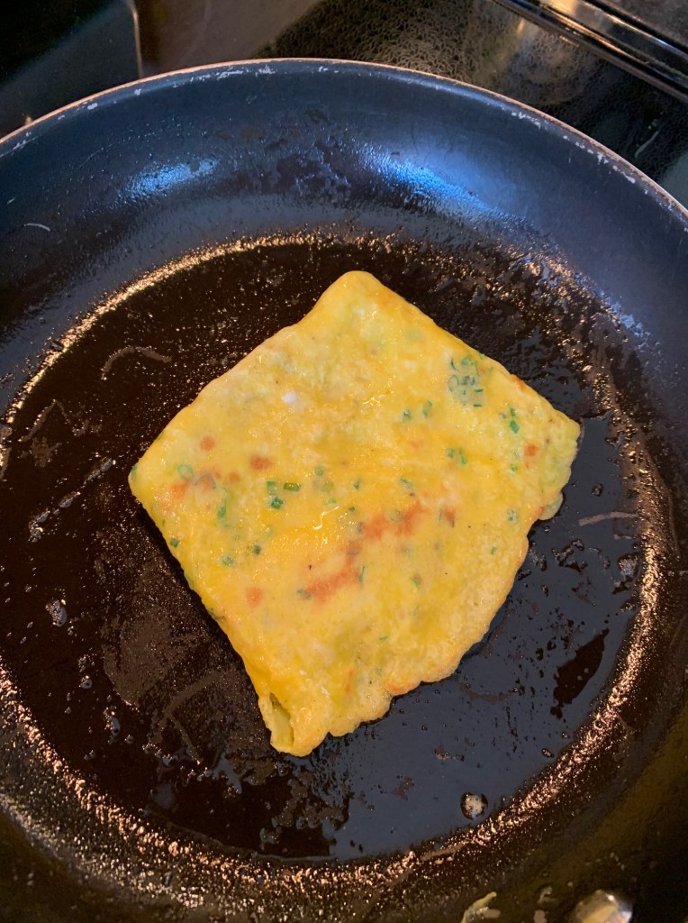 I’m making two sandwiches, so I divide that mixture in two and pour the first half into a non-stick fry pan that’s already sizzling with a neutral grapeseed oil.