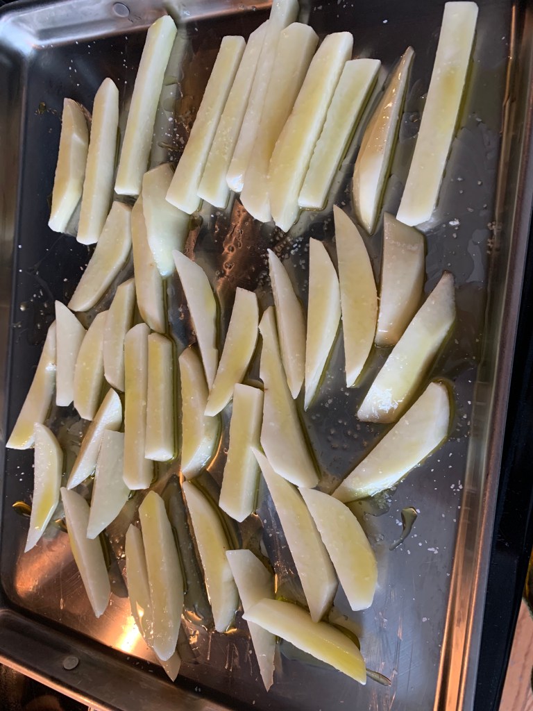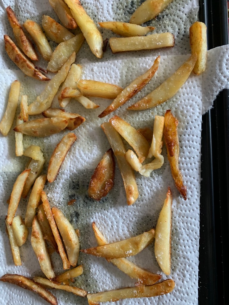 They are ready to go into a 400 F oven for 30 minutes before turning and another 10-15 minutes or until they’re golden brown. Once they’re ready, toss them onto a plate with paper towel to soak up the oil and sprinkle with kosher salt.