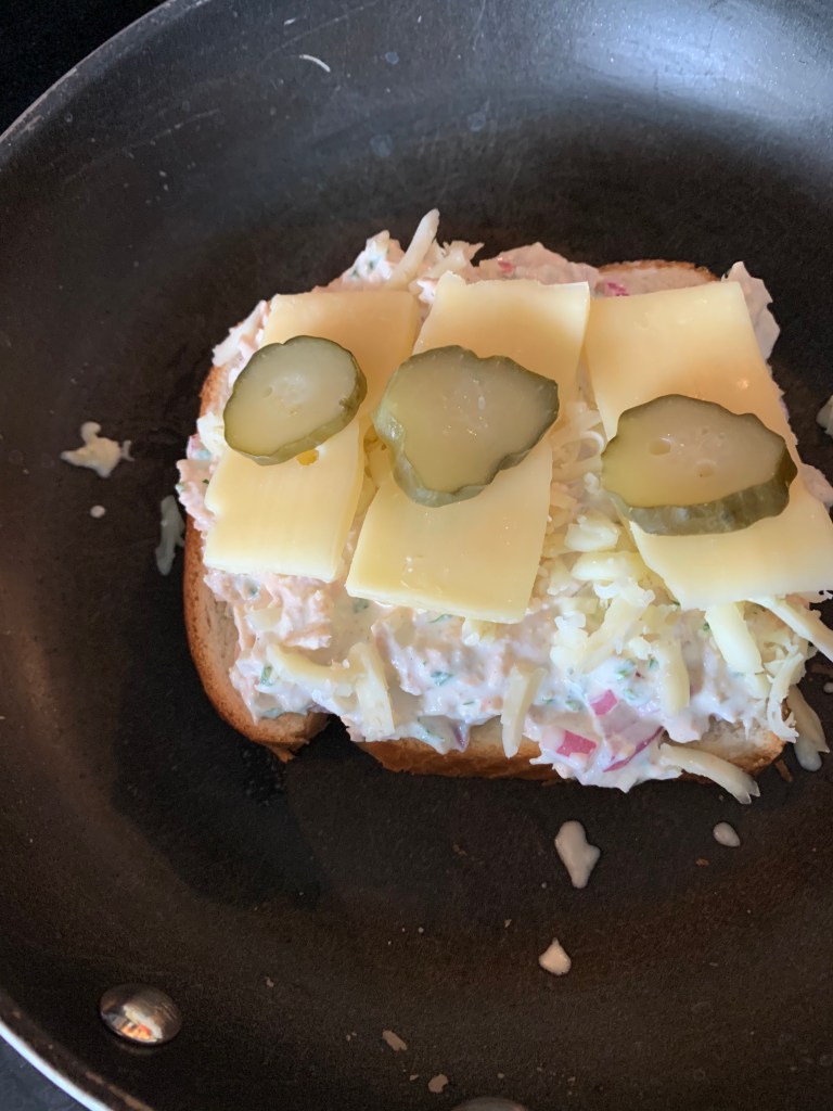 They’re crunchy on the outside and creamy on the inside. Perfect. Now let’s get this tuna melt happening. In a large frying pan, place one slice of bread, buttered side down, top with a 1/2-inch layer of tuna spread, the shredded Jack cheese, three Emmenthal slices, a thinly sliced pickles.