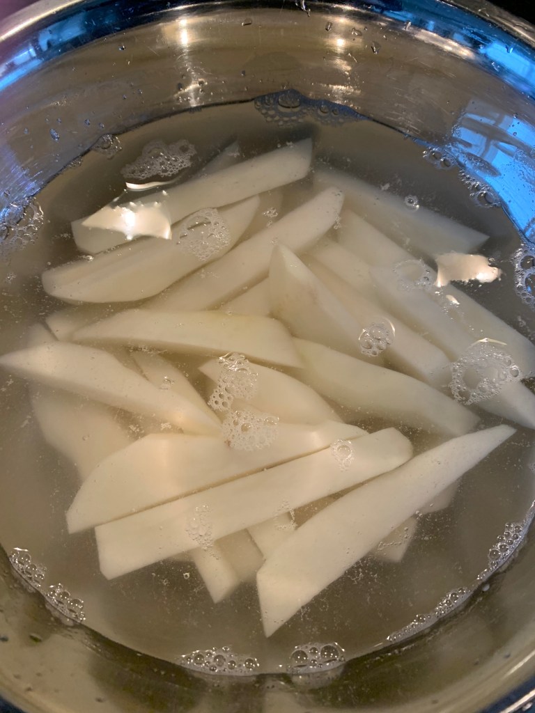 I start with the fries: Peel three russet potatoes and hand cut medium-sized fry slices, then get those potatoes into a bowl of cold water to soak for 1 hour.
