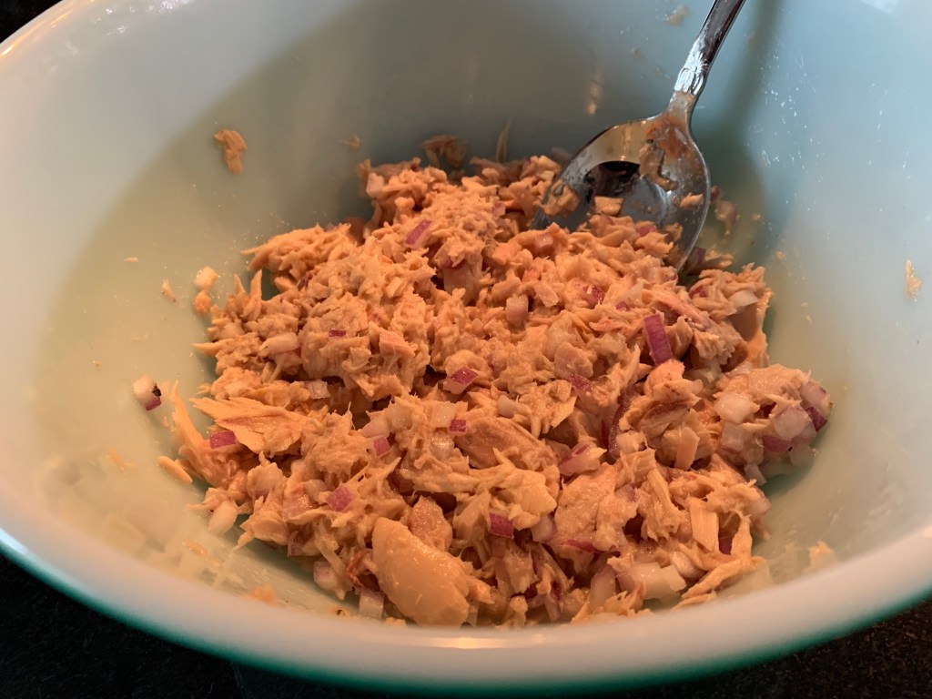 Now to get started on the tuna filling: Thoroughly drain two cans of tuna and keep it in the strainer in the sink. Add 1/4 cup minced red onion and squeeze the juice of one lemon onto everything, stirring to incorporate. You want the lemon to marinate the tuna and onion but you want to keep it draining so your tuna mixture doesn’t get soggy.