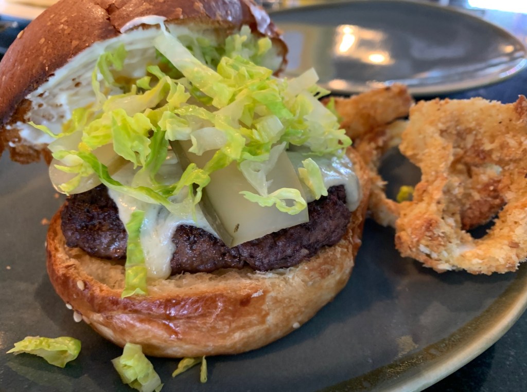 Ready to build my epic burgers. Craig’s first. He wants a plain bottom bun, topped with the havarti-blanketed burger. Diced white onion, two slices of pickles, and shreddice goes next. Top bun slathered in mayo and a swirl of yellow mustard completes the deal. He wants the onion rings on the side.