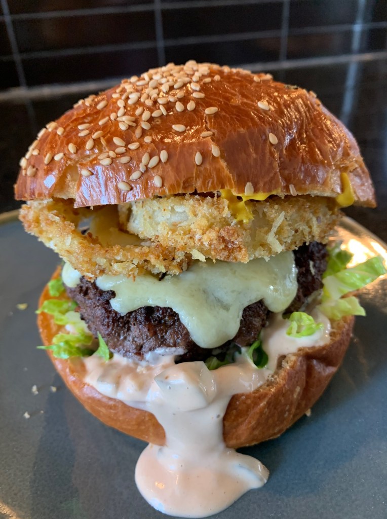 Why is this an epic burger? The creaminess of the special sauce, with the flavour hits of diced onion and pickle, is a star here—as is the crunchiness of the baked onion rings. The shreddice adds a hint of freshness and the cheddar burger is classic. It’s a huge burger—the most decadent burger I have ever made. What a great way to get out of my burger rut.