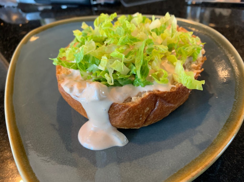 Now for my epic burger. Special burger sauce goes down on the bottom bun, then a handful of shreddice, because I think sauce and lettuce should go together.