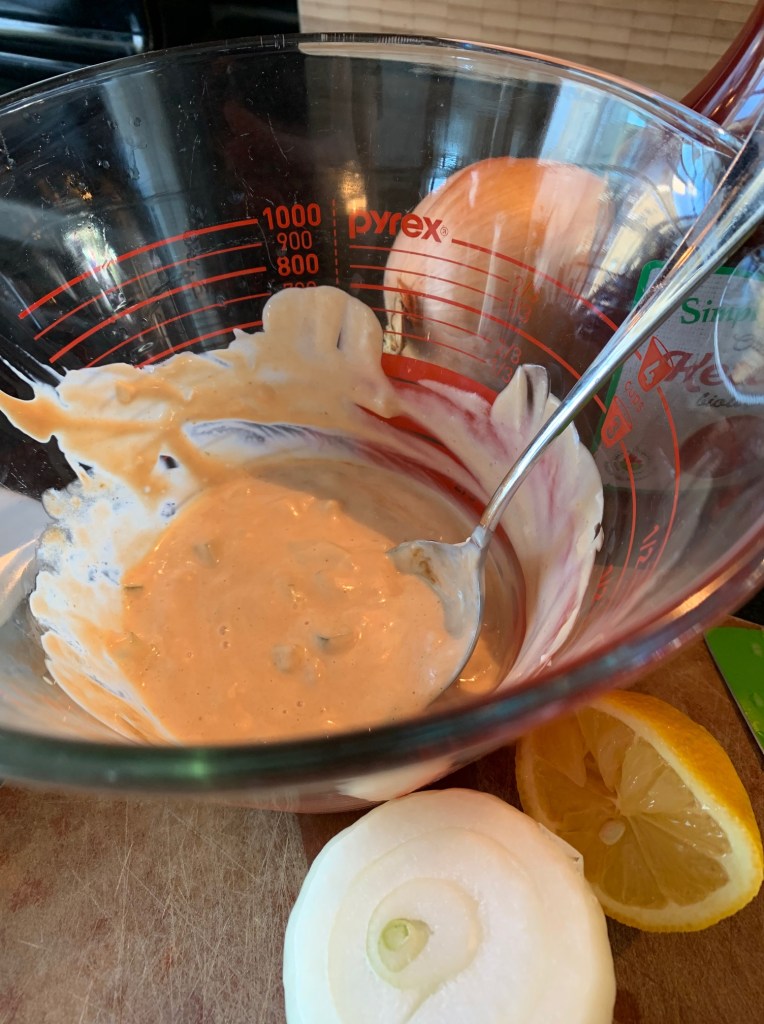 Now think about your condiments. Usually I’m just happy with mustard, but today I’m trying to break from the routine, so I’m making a special sauce: 1/4 cup mayonnaise, 2 tbsp ketchup, 2 tbsp diced dill pickle, 1 tbsp minced onion, a squeeze of lemon for brightness.