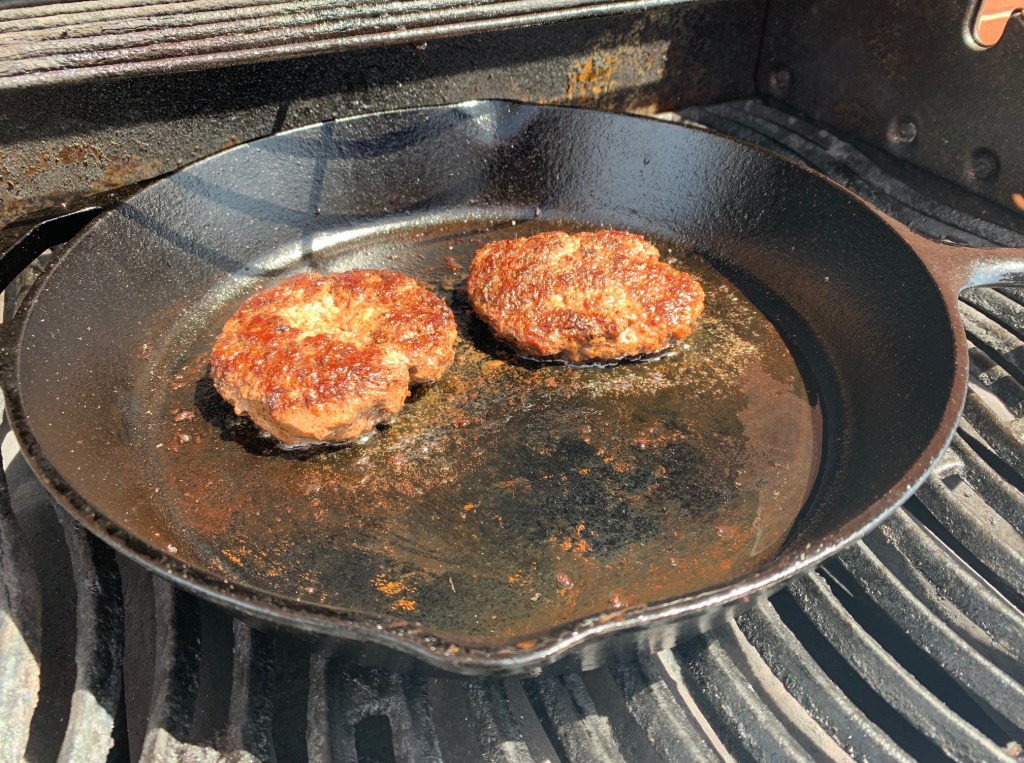 Now, about the humble hamburger: I know most of us grew up with the hockey puck treatment of hamburgers—beef, breadcrumbs, egg, a ton of spices. Form into a kind of ball and grill. I much prefer a straightforward approach. Start with a good quality of ground chuck (lean). For 4 thin patties, divide 1 lb. of ground beef into 4 balls; for 4 heftier patties, divide it into 2 balls. Form into a flat patty and, using your thumb, create a dimple in the middle of the patty. Season with salt and pepper. Into a hot cast iron pan it goes (we do it on the BBQ, in the pan, on high heat) and cook until you’ve got a good brown crust on each side. Like this: