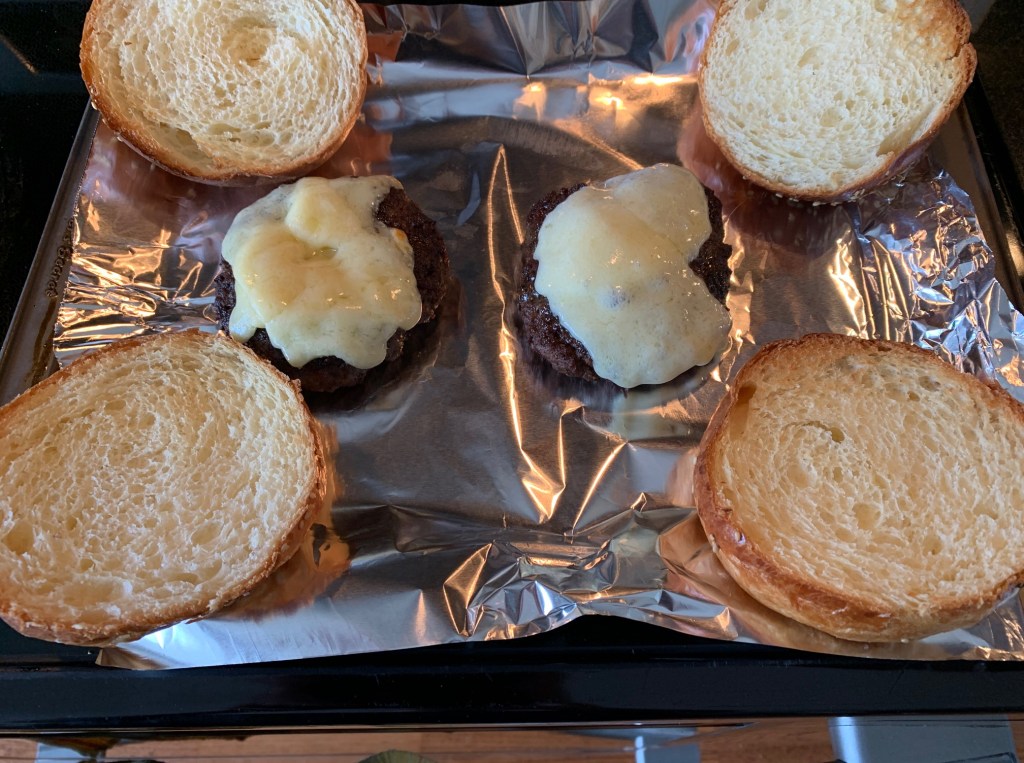 Time for cheese! I’m topping my burger with a few thin slices of sharp white cheddar and I’m topping Craig’s burger with a thin slice of Havarti—under the broiler to give it a good melt. Buns, cut side up, go under the broiler at the same time.
