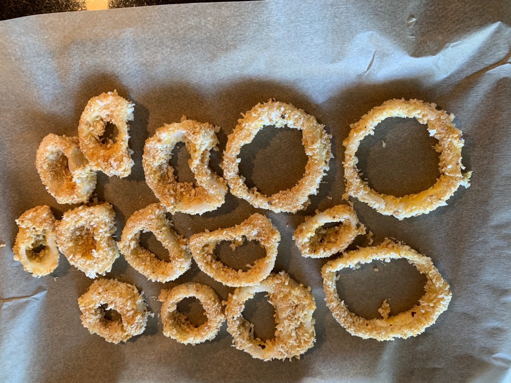 Time for assembly: Take an onion slice, dip it in the flour mixture, then the egg mixture, then the breadcrumb mixture, making sure the breadcrumbs really stick. Place it on a baking sheet lined with parchment paper, and repeat until all of your onion rings have been dredged.