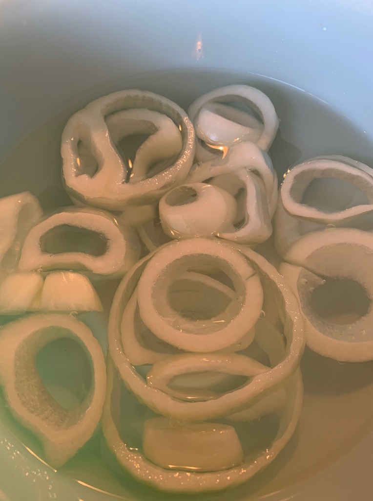 Now for the extra special topping: I’m making homemade baked onion rings that are so good and so easy to make, they’re going into my regular treat rotation. Slice two white onions 1/2″ thick. Separate them, removing any filmy skin in between the layers. Pop those into a bowl of cold water.