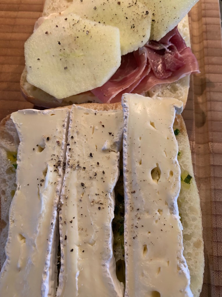 Add proscuitto, thinly sliced apple and brie, season with pepper, and into the panini press it goes.
