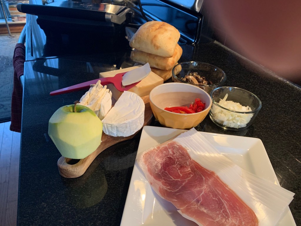 Stack up some ciabatta buns. Set out a range of panini fixings: 2 or 3 sliced cheeses (I’m using brie and gruyere), proscuitto, thinly sliced apple or pear, roasted mushrooms (mine were marinated in a soy/lemon sauce), thinly sliced roasted red pepper, sliced tomato, ribbons of fresh basil, minced onion.
