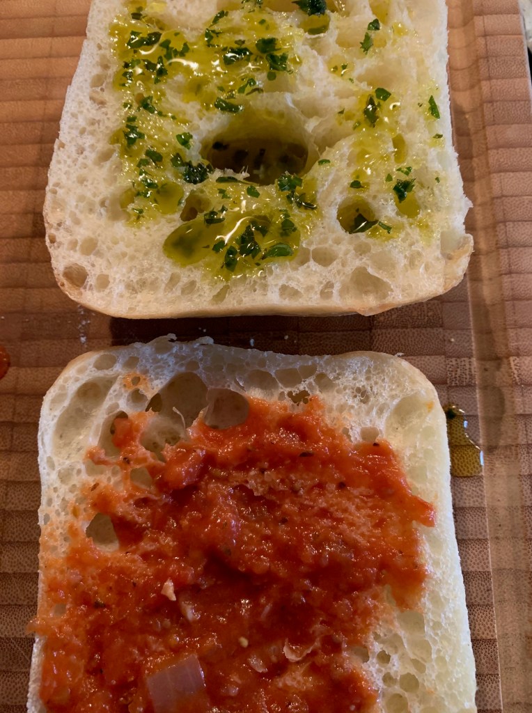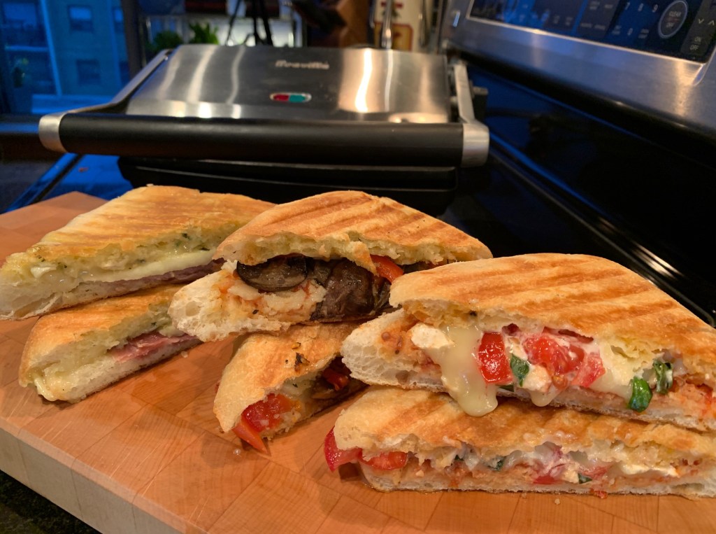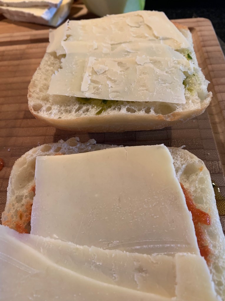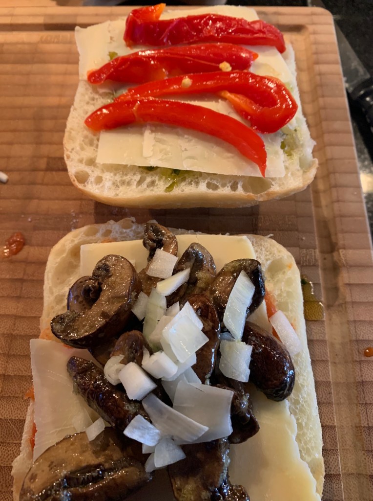First up: I’m making a mushroom and gruyere panini. I’ve got leftover roasted mushrooms and red peppers in the fridge, so they’re going in. I thinly slice the gruyere, cut open a panini bun and drizzle some homemade basil oil (minced basil, olive oil) on one cut side of the bun and a smear of leftover marina sauce on the other bun.
