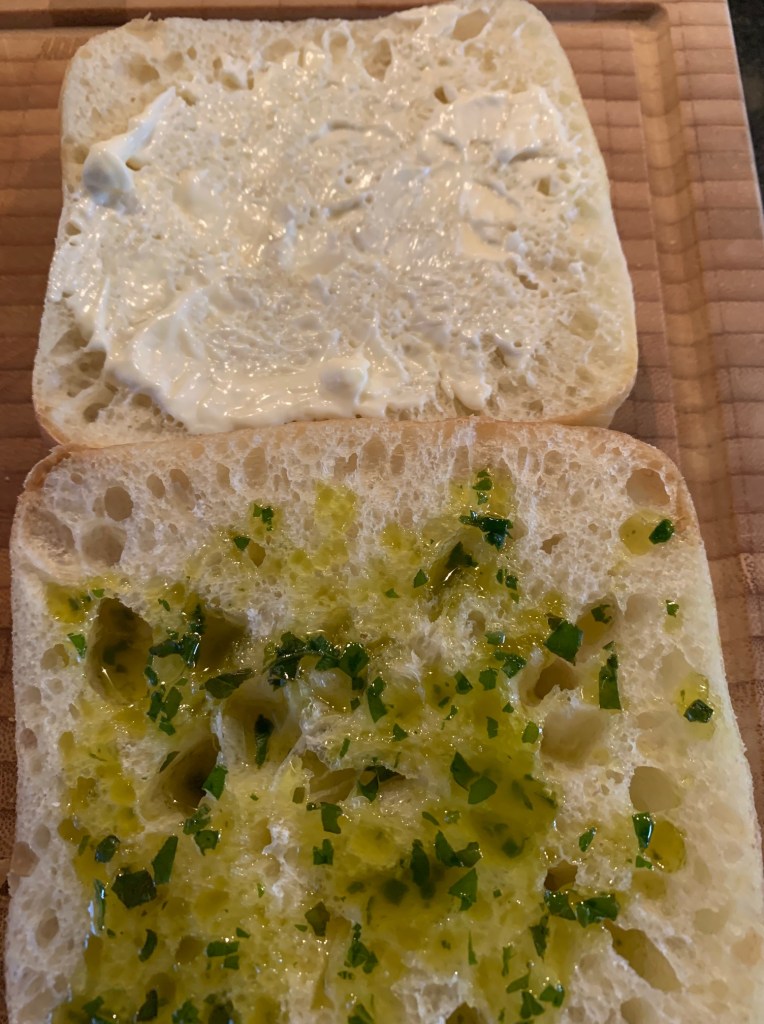 Into the panini press and on to the next panini. Cut open another panini bun, spread mayo on one side, basil oil on the other.