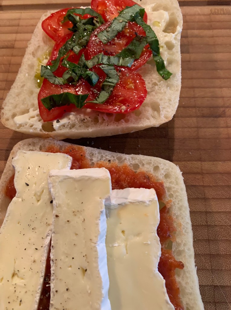 Last panini up: Cut open another panini bun, smearing mayo on one side, basil oil on the other. Top with sliced tomatoes, shredded basil, and brie.