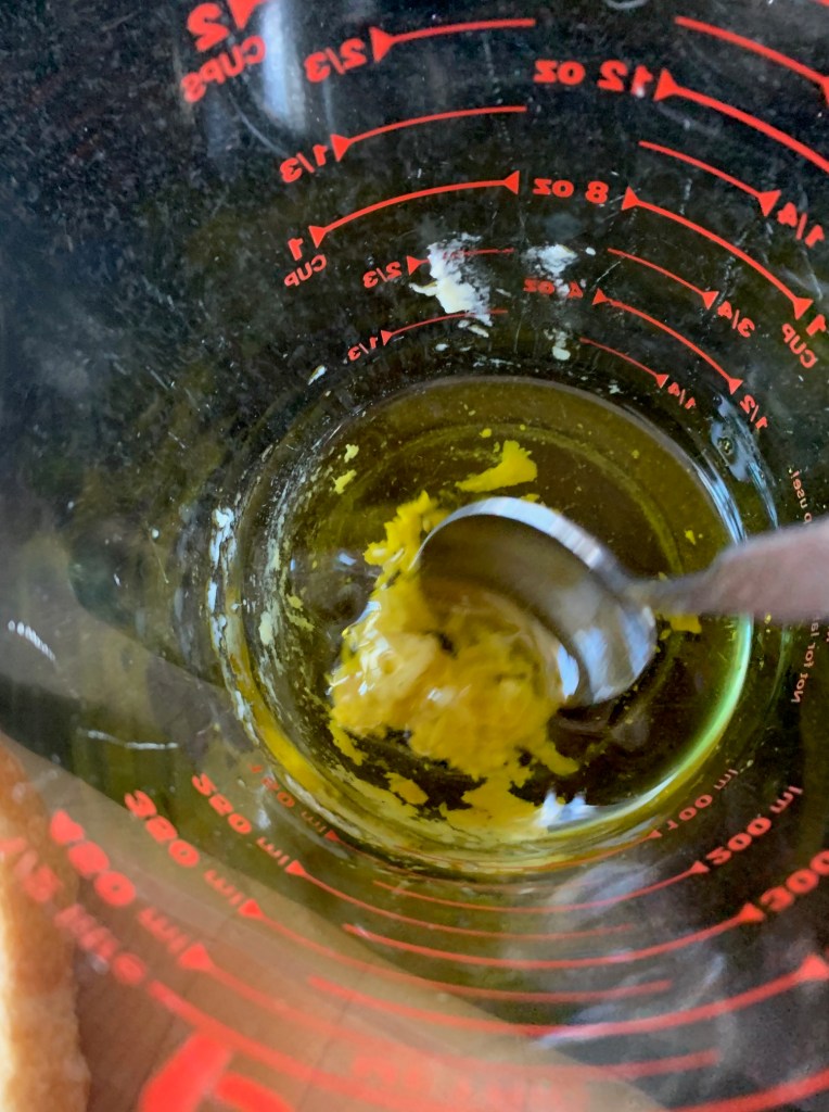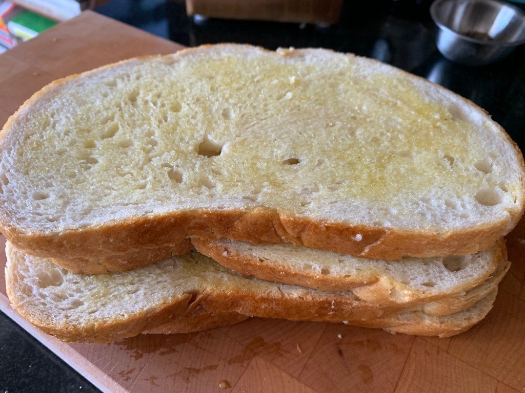 Slather that onto both sides of the bread, stacking each bread piece on top of each other so that the oil is absorbed on every piece.