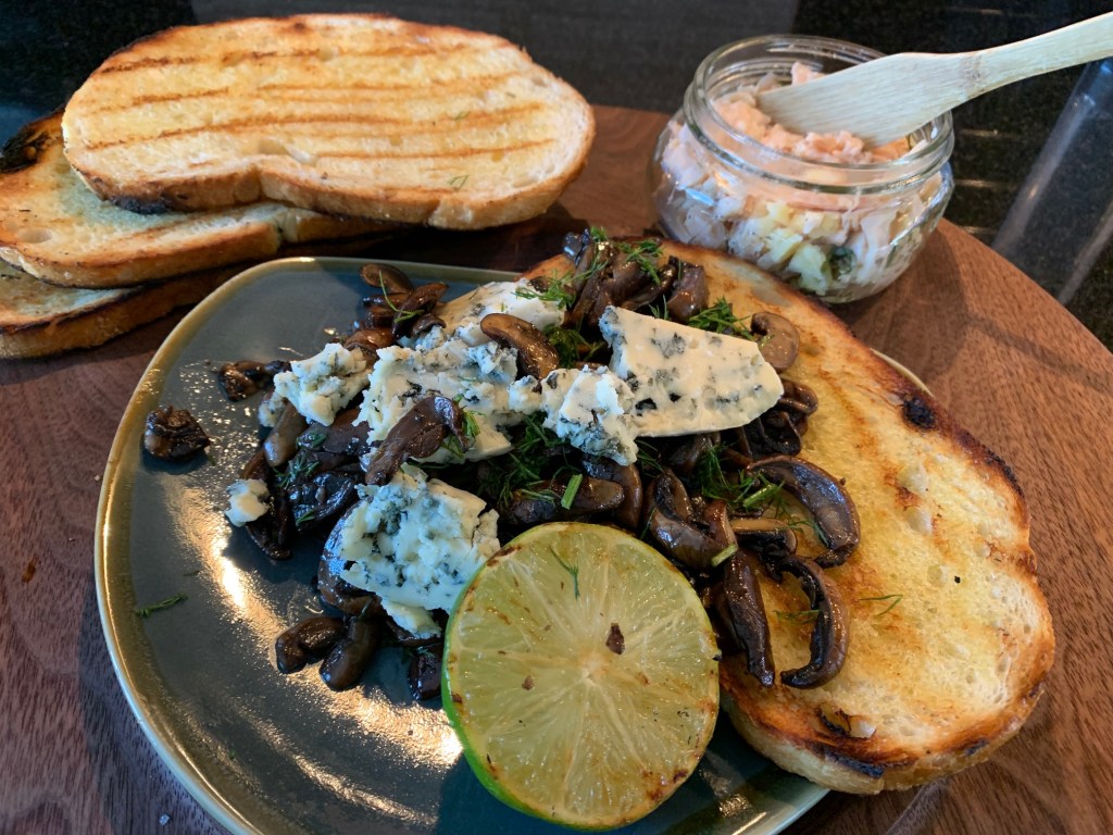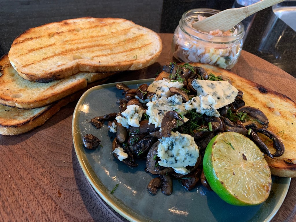 It’s warm enough to get the BBQ going and I say it’s time to grill some rustic bread brushed in roasted garlic olive oil and top that with hot sauteed mushrooms, delicious blue cheese, and a side of potted fish.