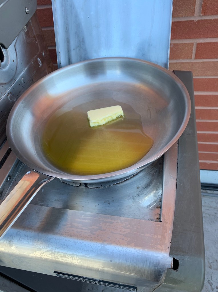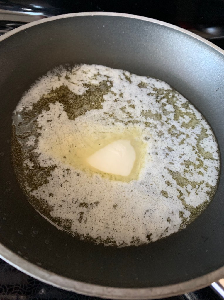 Melt a knob of butter. You could clarify the butter here by skimming off the milk fat solids, but this isn’t a Martha Stewart blog so everything is going into our potted fish.