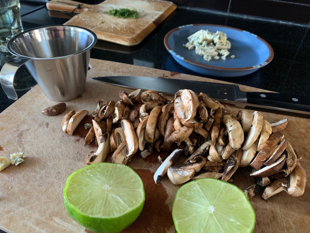 Now to get the mushrooms ready. I clean my mushrooms and give them a fairly thin slice. I’ve also cut a lime in half–I’m going to throw that lime, cut side down, onto the BBQ as I grill my bread. Grilled lime or lemon halves squeezed on your dish at the last minute elevates everything. Highly recommend. Blue D’Auvergne is sliced. I’ve got a half cup of white wine at the ready for once I’ve crisped up my mushrooms.