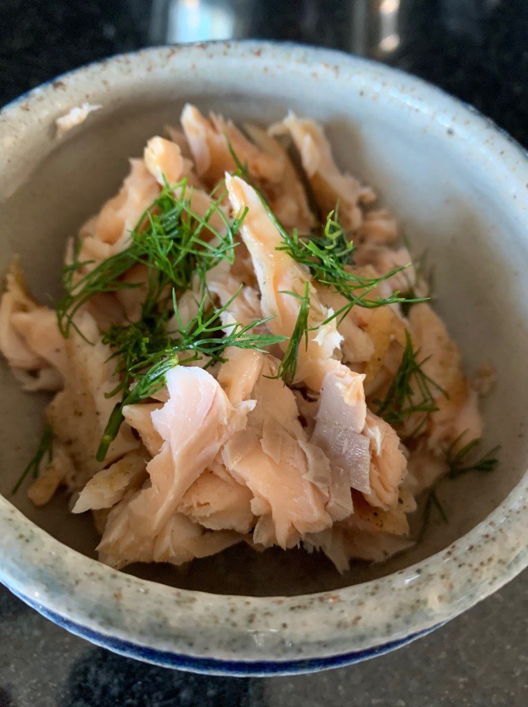 Let’s start with trout: I’m making potted fish. You can use any cooked fish that didn’t get consumed the night before. This is the simplest, most elegant thing you can do with leftover fish. I flake the trout, add some fresh dill because I have it (not necessary for this dish).