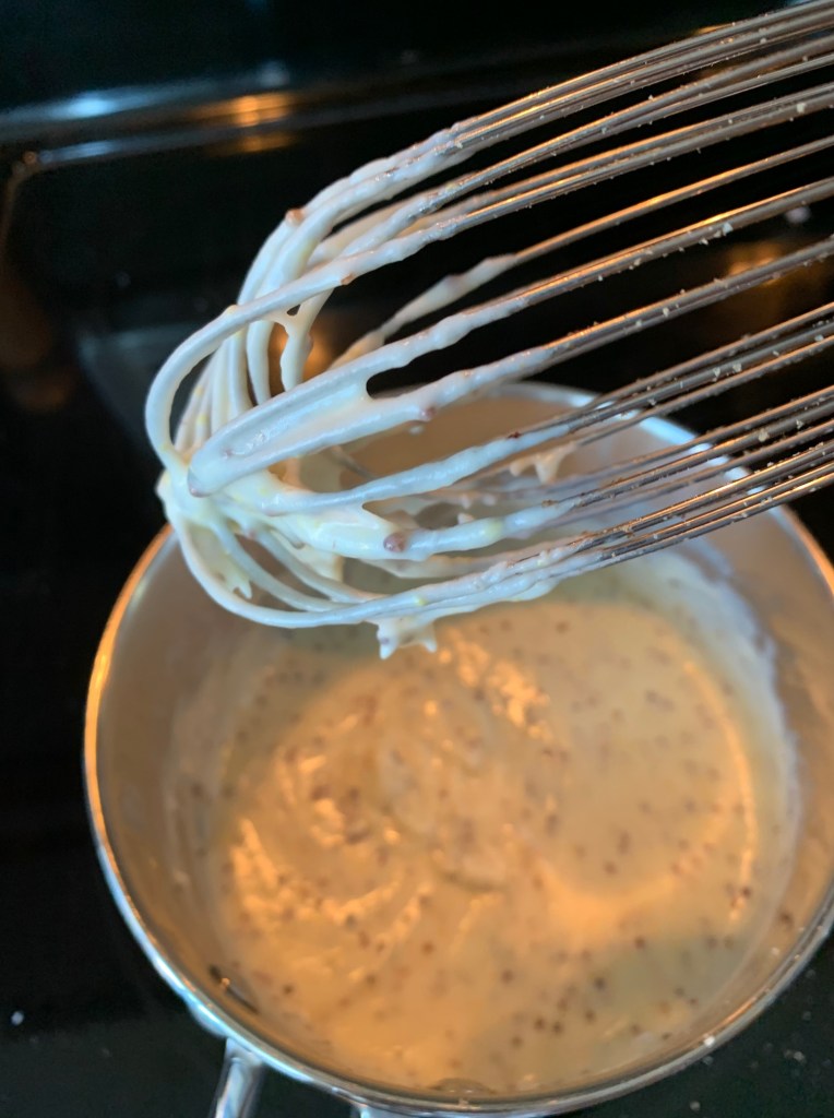 Now that it’s nice and glossy, slowly whisk in the milk and keep whisking until it’s got a thick consistency. Like this.
