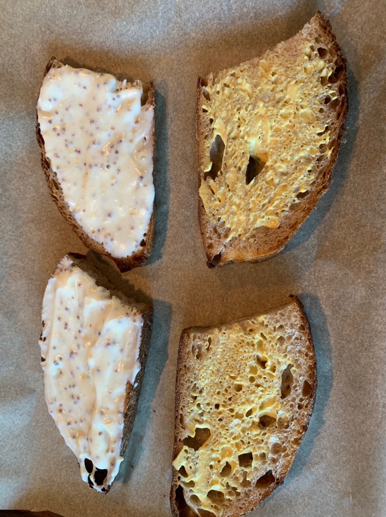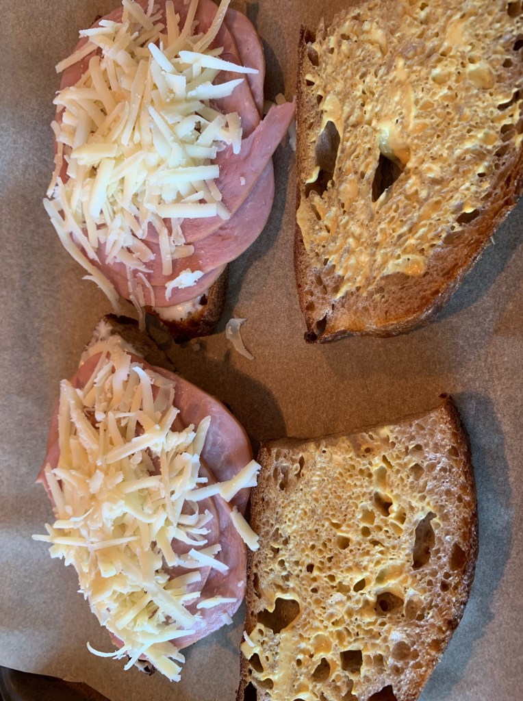 Time to build our sandwich! First, I’ve set the oven to 350 degrees and prepared a baking tray with parchment paper. Down goes four slices of rustic sourdough bread. Spread dijon mustard on two of the slices (they’ll go on the top of the sandwich) and spread béchamel on the other two slices (they’ll go on the bottom of the sandwich).