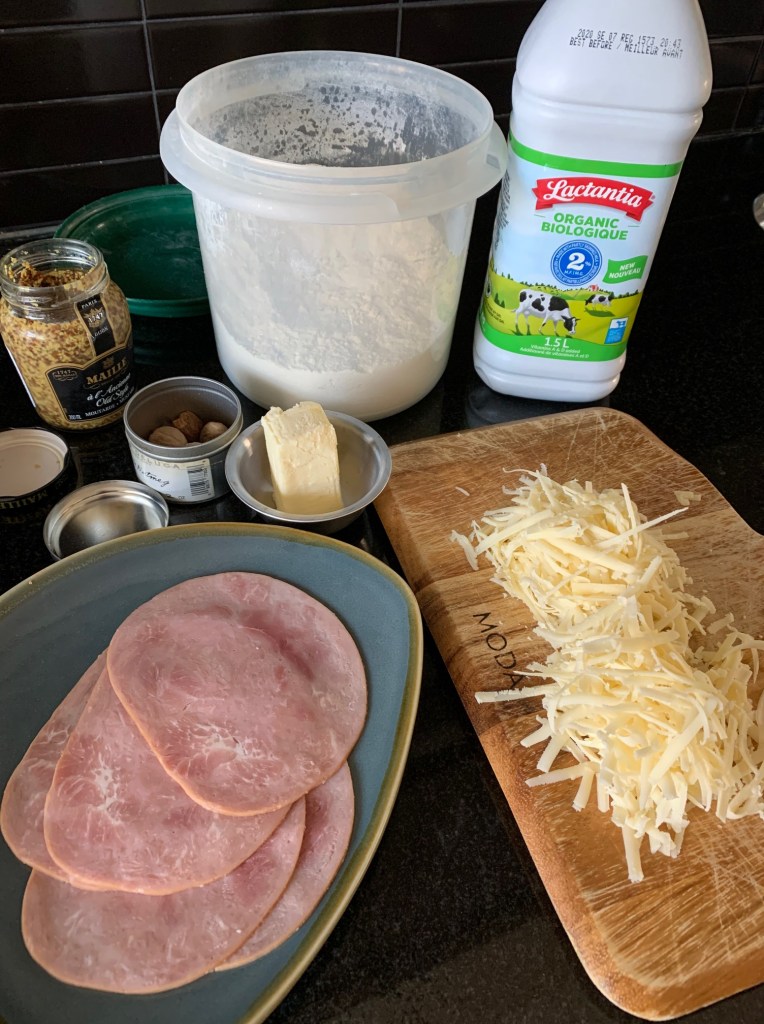 First, my mise en place for the béchamel, which is my favourite of the five mother sauces. I’m going to need 1/4 cup butter, 1/4 cup flour, 1-1/4 cups milk (a little less than what the Bon Appetit recipe calls for), 2 tbsp. grainy mustard, and 1/2 tsp freshly grated nutmeg, salt to taste. I’ve also grated 2 cups of gruyere cheese and set aside slices of ham.