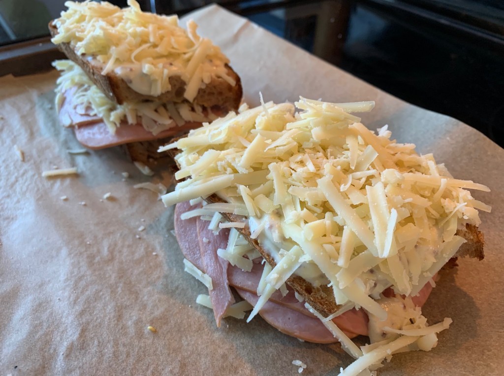 Top that with the other slice of bread, mustard side down. Spread some more béchamel sauce on that top slice of bread and top that with a generous amount of cheese for melting. You want both sauce and cheese at the top — it’s what makes this such a special sandwich.
