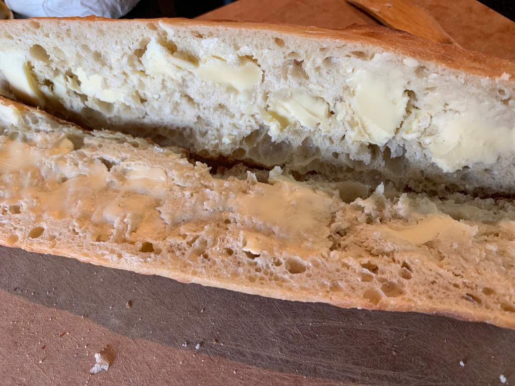 I’m only using half a baguette here, so I slice the baguette in two and then slice one half lengthwise, then slather that half with a generous amount of good quality salted butter. Don’t skimp: the butter should be memorable.
