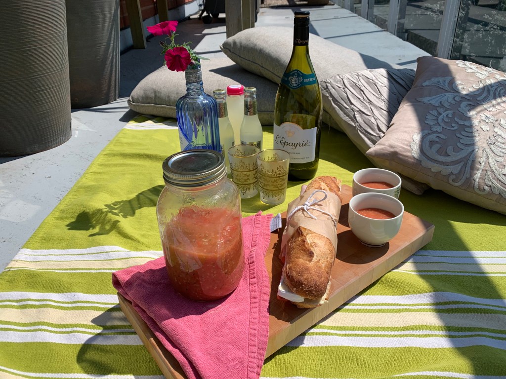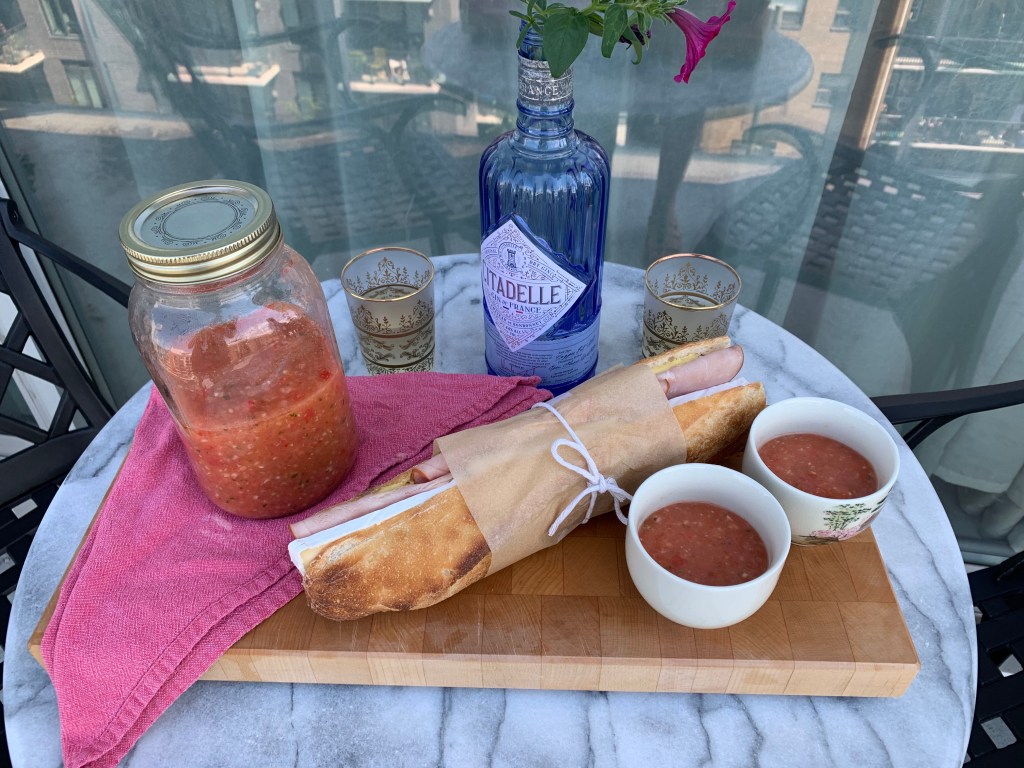 For my picnic, I’ve got my jar of chilled gazpacho, a few small ceramic cups for sipping, the jambon et fromage baguette, chilled white wine and it’s what summer is supposed to be all about. Good ingredients, simple food done right. Totally picnic worthy.
