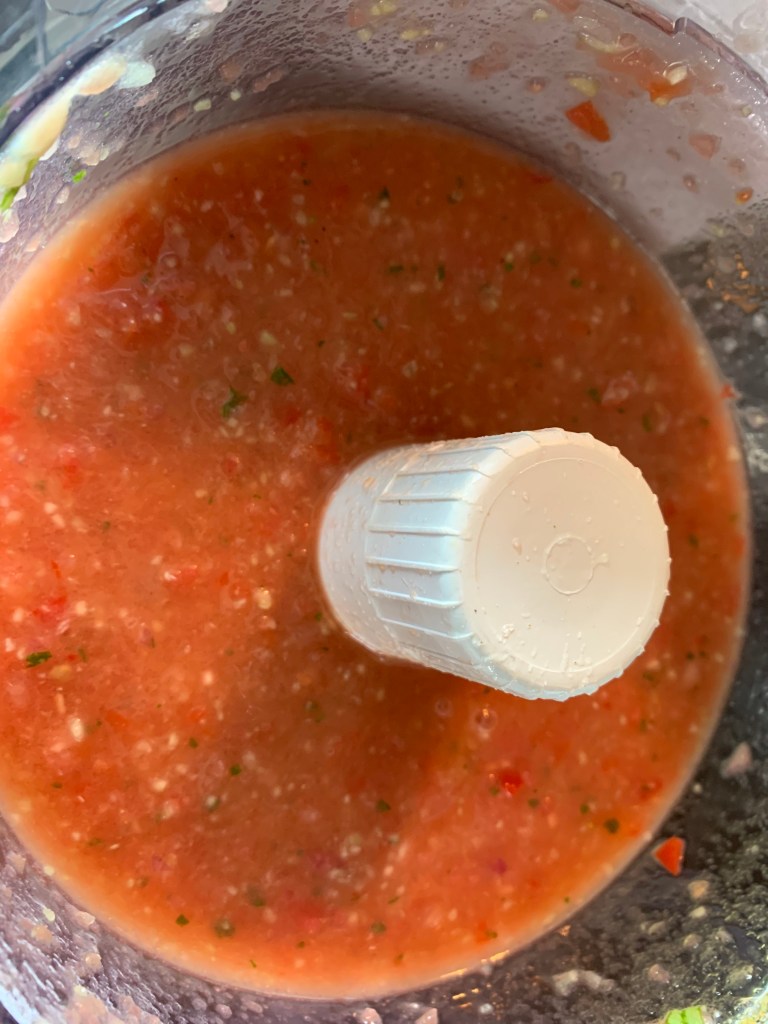 Into a food processor I’m putting: 3 roughly chopped beefsteak tomatoes, 1/4 of a red pepper, chopped, 2 peeled mini cucumbers, 1 diced shallot, 2 cloves diced garlic, a handful of basil leaves, juice of 1 lime, 1 tbsp red wine vinegar, 1 tbsp olive oil, salt and pepper to taste. (Add up to 1/4 cup water to smooth things out).