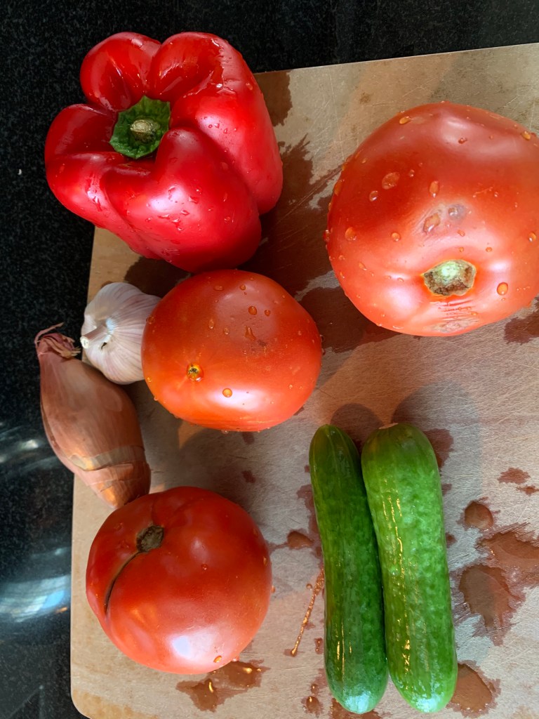 Let’s start with the gazpacho. There are so many versions of this excellent Spanish chilled soup. I’m going rustic except no bread (because I’m making a ham and brie baguette, so there’s enough bread in this picnic).