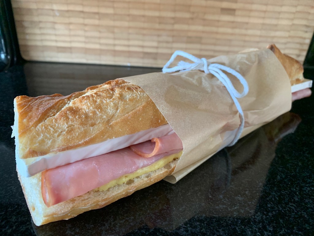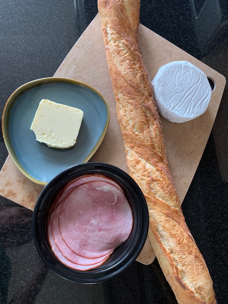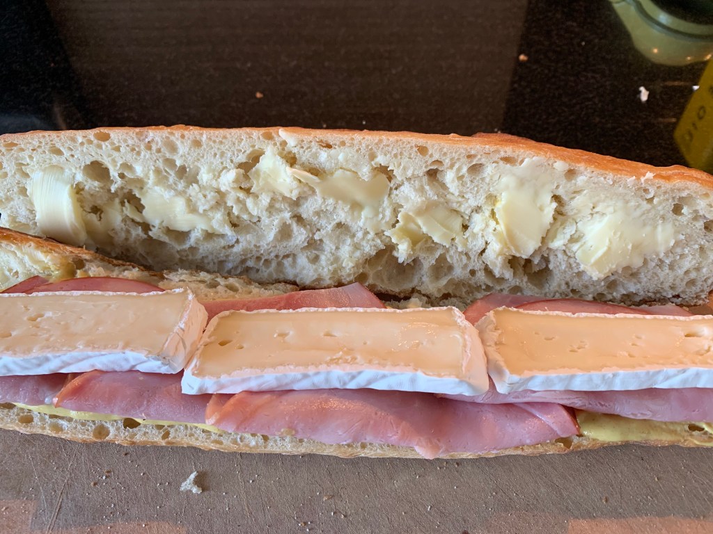 We need a sandwich for our picnic and I’m remembering walking the streets of Paris and getting a streetside ham and brie baguette. So simple, so good. Here’s my basic mise en place: good butter, a good wheel of brie, nice country ham.