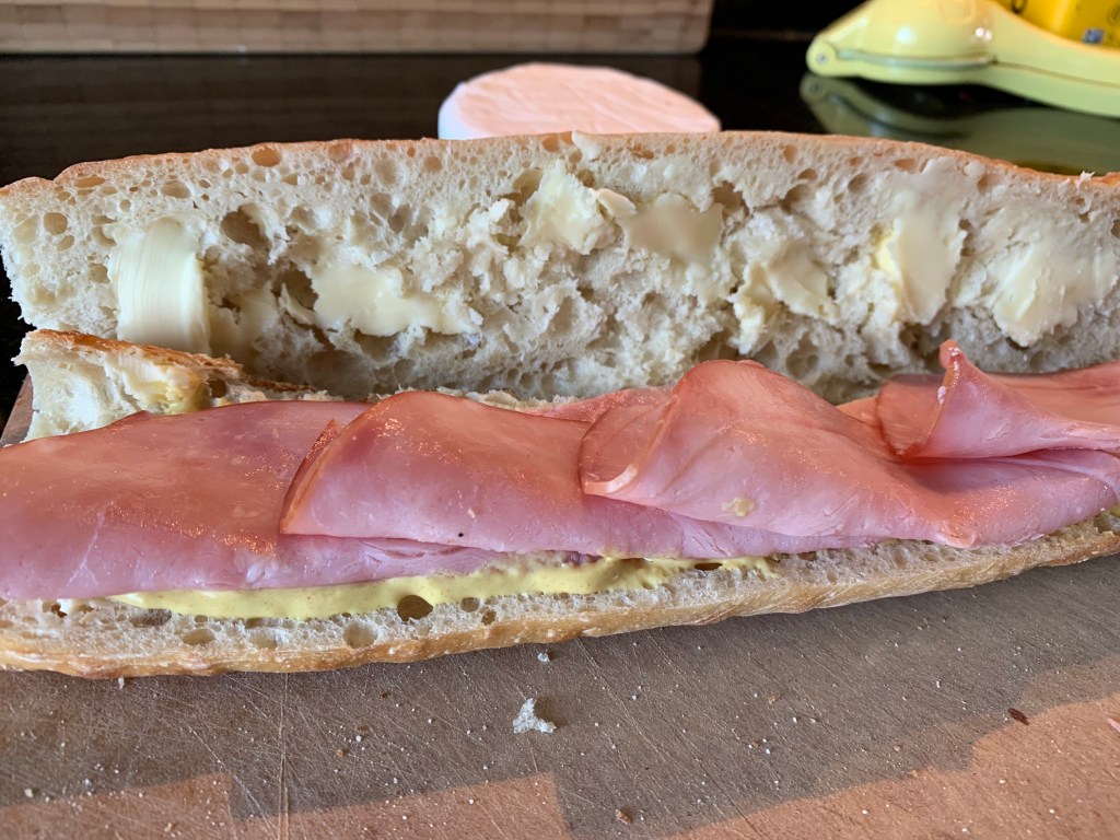 It’s not traditional to lay down a spread of dijon but I do so on the bottom baguette because if I can put mustard on a sandwich, I will. And then down goes the ham.