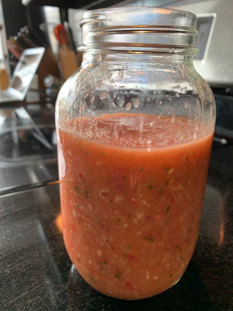 I like my gazpacho a little chunky but am also happy to have a perfectly smooth gazpacho. Either way, it’s summer in a bowl/cup. That gets jarred and stored in the fridge for up to two days.