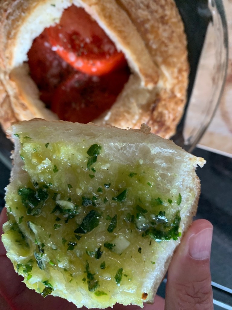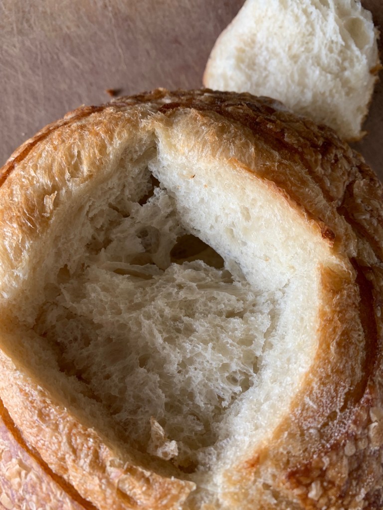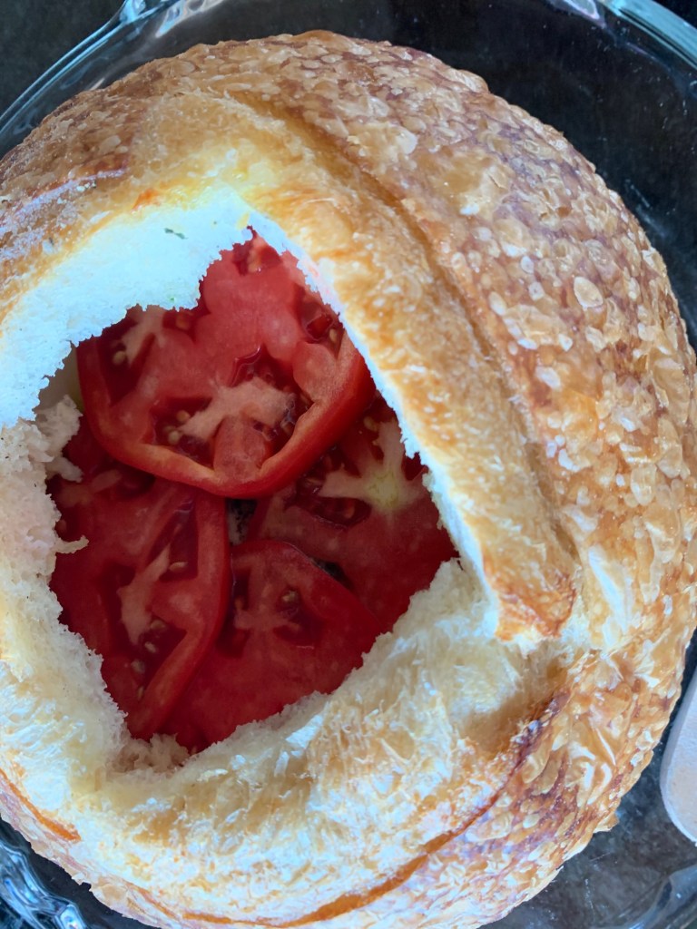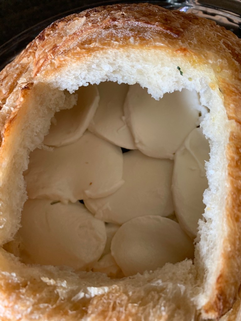 For my pesto caprese loaf, I’m starting with a beautiful fresh sourdough boule from Fred’s bread.